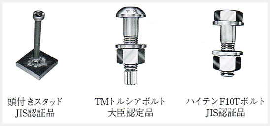 - 頭付きスタッド(溶接スタッド) 当社の頭付きスタッドは厳選された、シリコンキルド鋼又はアルミキルド鋼を使用し溶接作業に適した安定した品質を確保する為に材料、製造方法を駆使しております。又、地震の多い我国では耐震補強材として土木建築における鋼・コンクリート間の結合材(ずれ止)として、優れた施工性の為、頭付スタッドが広く採用されており又、土木橋梁関係においては殆どが頭付きスタッドを使用しております。(現在国内に5社のみです。)